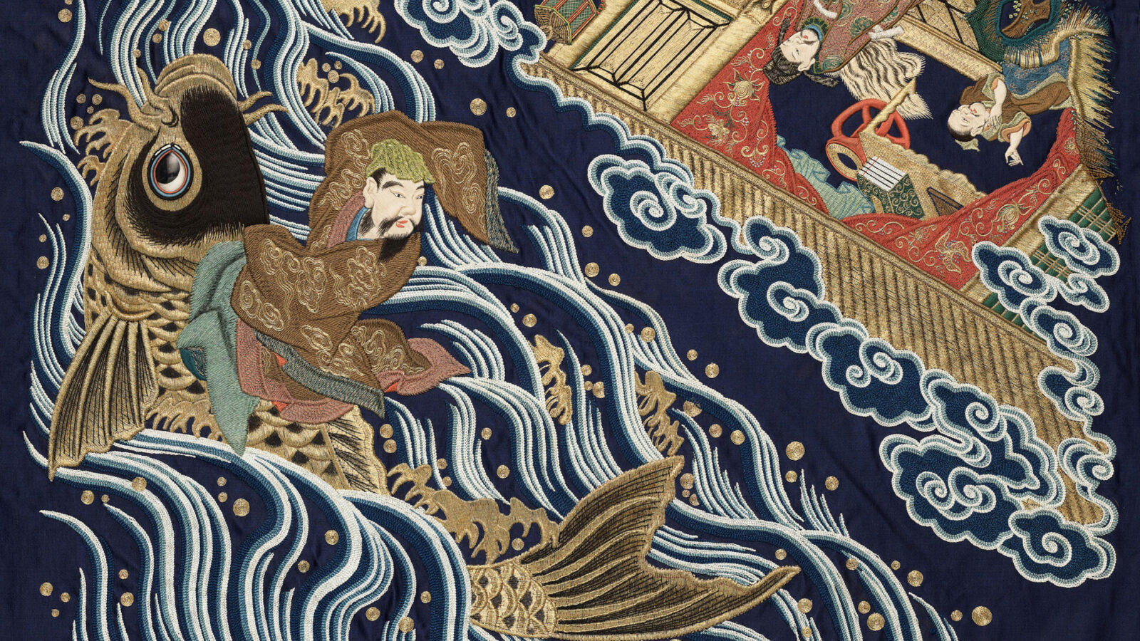 On view adjacent to the fukusa installation, an altar cloth (uchishiki) provides a spectacular example of similarly expert technique, using detailed embroidery to depict a scene from the story of Daoist immortal Qin Gao riding a carp.