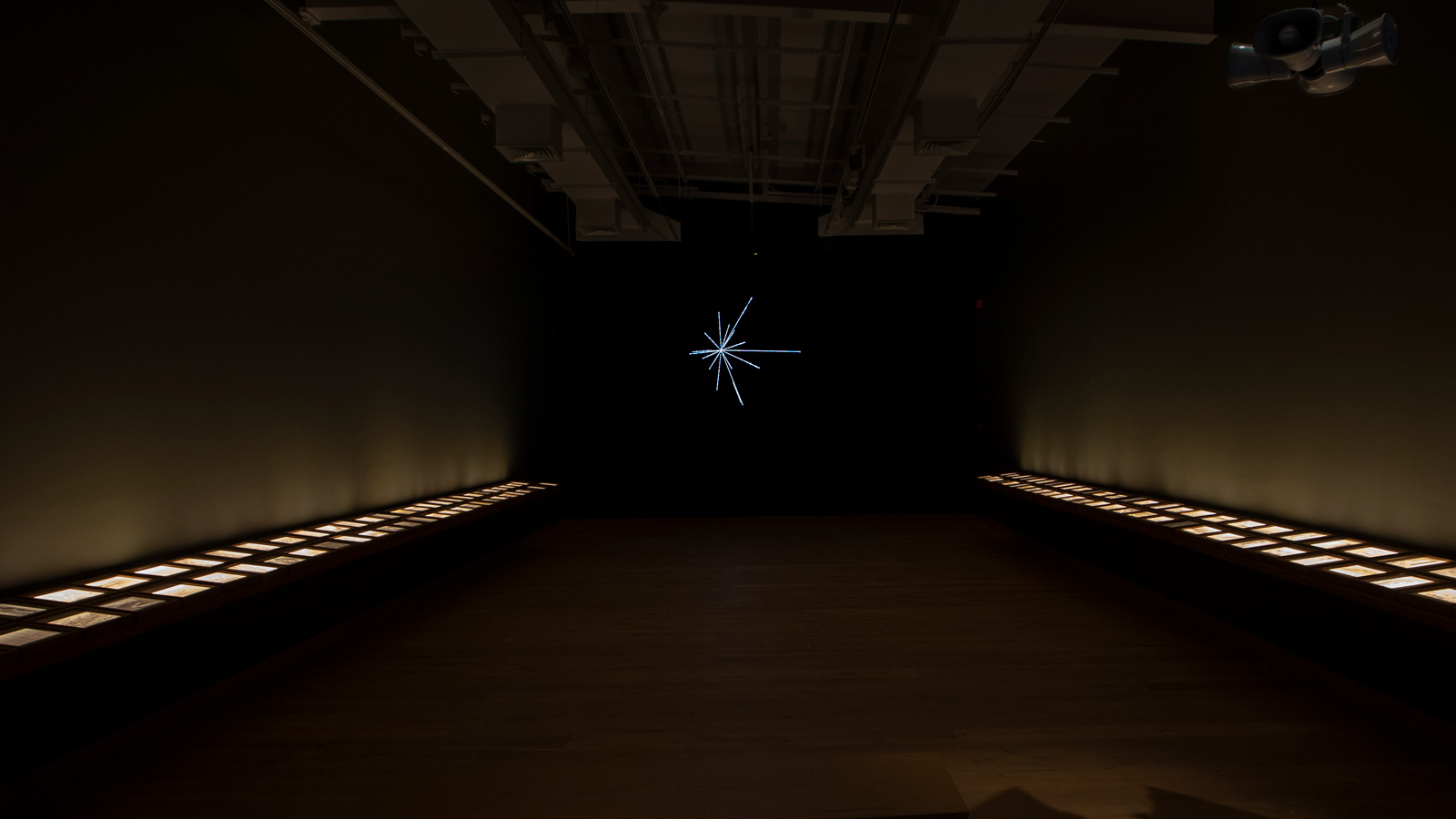 As the sound of greetings in 55 languages permeates the gallery, diverse backlit images pulse slowly, including scientific diagrams, representations of flora and fauna, and depictions of human anatomy and genetic makeup. These 116 visuals, originally encoded as audio signals on the Golden Records, were later converted back into images by U.S.-based engineer Ron Barry, imagining how they might appear to extraterrestrial viewers. A video projection of the Pulsar Map, derived from the cover of the Golden Record, maps the location of our solar system in the galaxy as a kind of cosmic return address.
