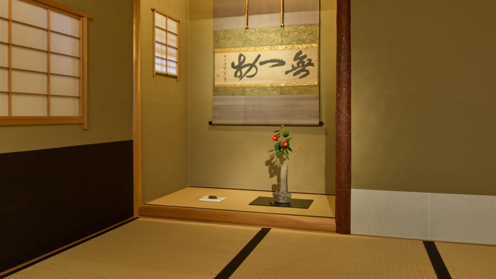 In the alcove, a hanging scroll by Chuho Sou (1760–1838), the 418th chief priest of Daitokuji Temple in Kyoto, bears a three-character inscription reading Muichimotsu: “All things are nothingness.” The phrase is a Zen Buddhist reminder to free oneself from desire and attachments — an appropriate message for a tea gathering, and an intriguing thought to consider while enjoying the teahouse’s atmosphere of minimalist serenity.