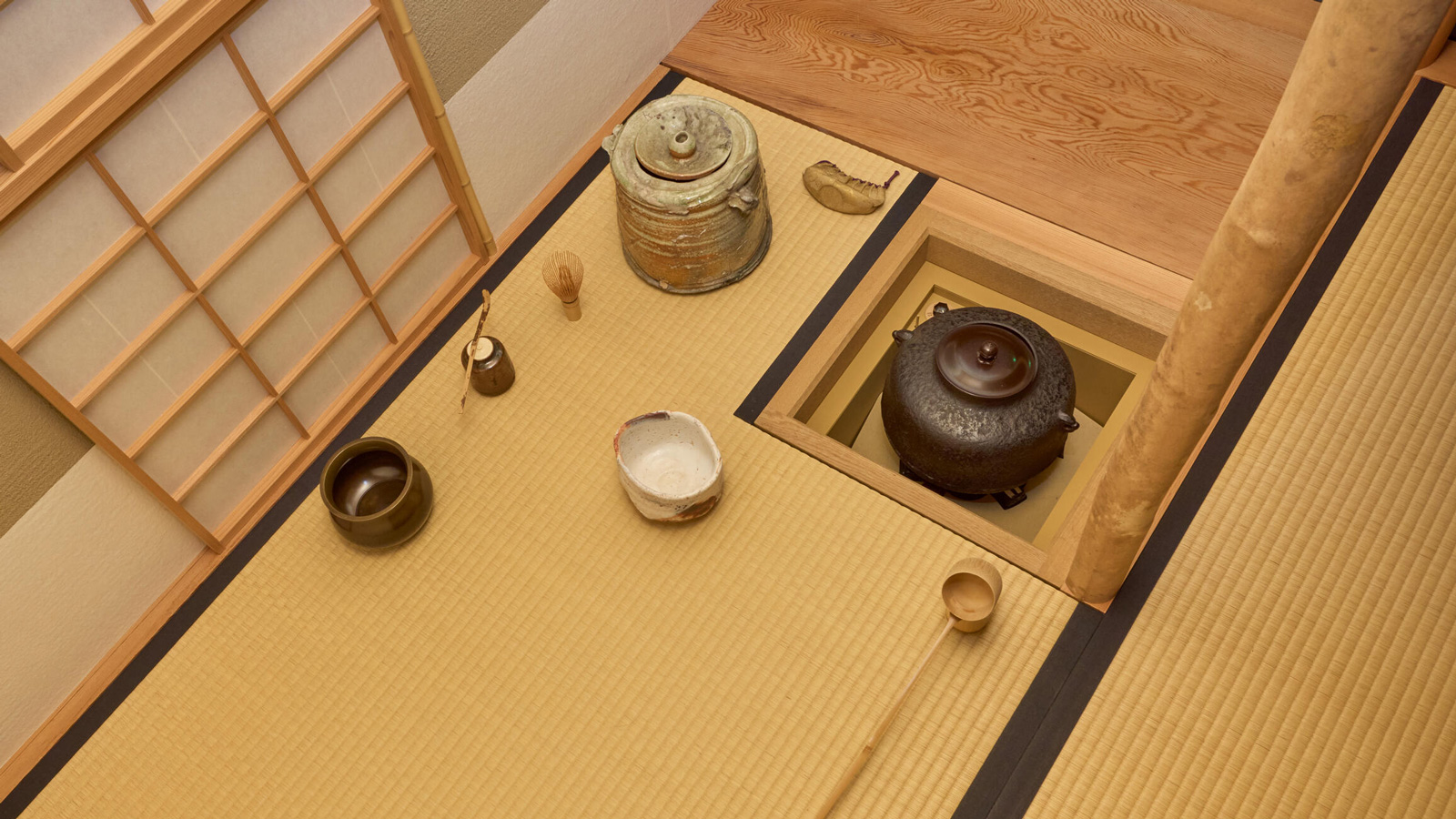 The teahouse currently offers examples of rustic ceramics including a tea bowl, freshwater jar, and flower vase by renowned artist Tsujimura Shiro (b. 1947), curated by Associate Curator of Japanese Art Yuki Morishima.