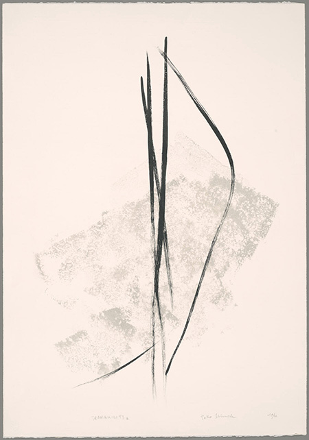 Images: top—Installation view in the Tateuchi Japanese galleries; inset—Tranquility B, 1980s. by Shinoda Toko (Japanese, 1913 – 2021). Lithograph, ink on paper. Asian Art Museum, Gift of Frederick L. Gordon, 1998.37. Photographs © Asian Art Museum of San Francisco.